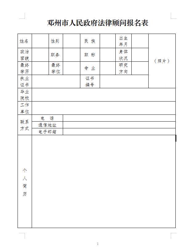 附件:邓州市人民政府法律顾问报名表[点击下载]