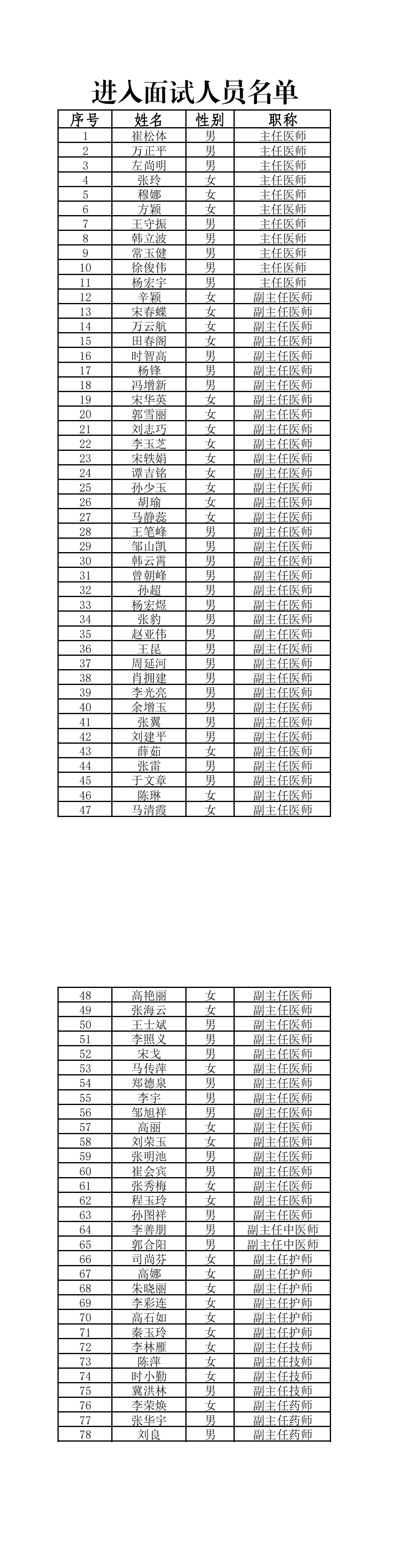 2023年邓州市卫生健康系统面向社会公开招聘卫生类副高级及以上职称人员报名、初审工作已结束。按照《2023年邓州市卫生健康系统面向社会公开招聘卫生类副高级及以上职称人员公告(第1号)》要求,确定进入面试78人,现将进入面试人员名单及面试有关事宜公告如下: