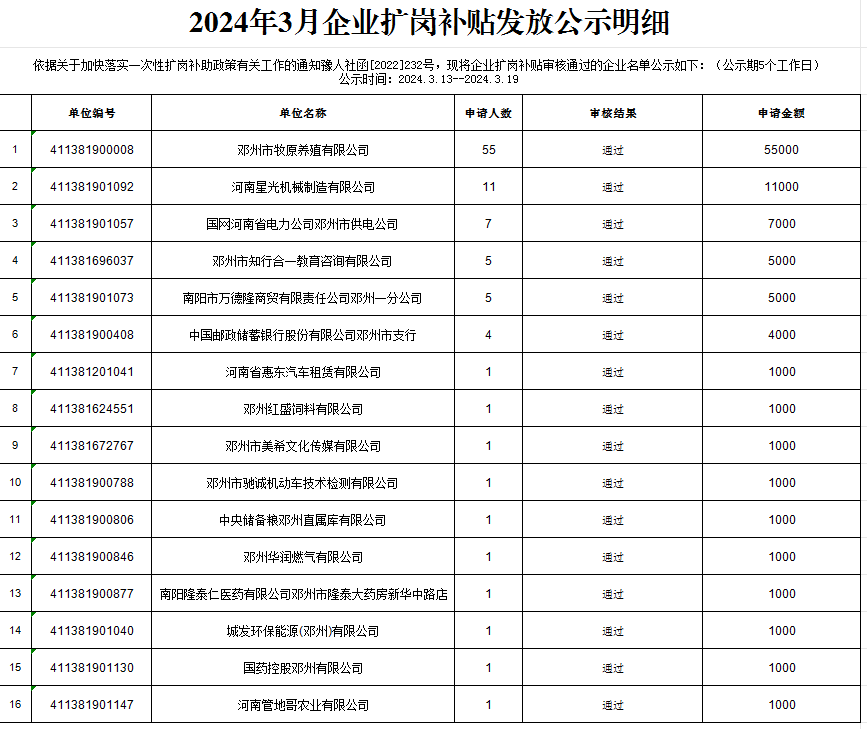 2024年3月企业扩岗补贴发放公示明细