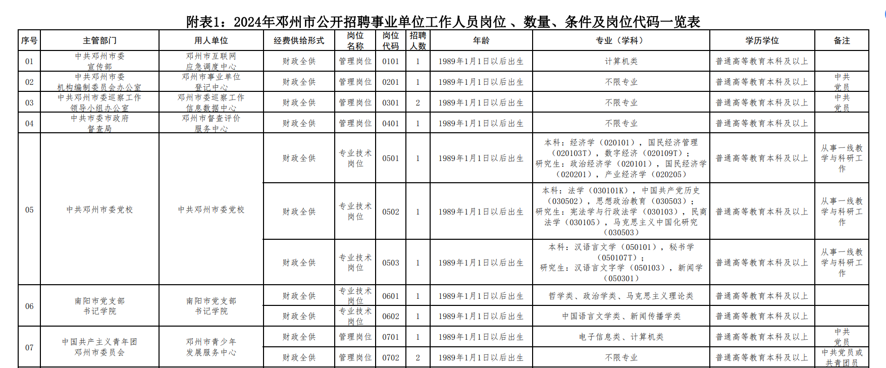 附表1:2024年邓州市公开招聘事业单位工作人员岗位、数量、条件及岗位代码一览表