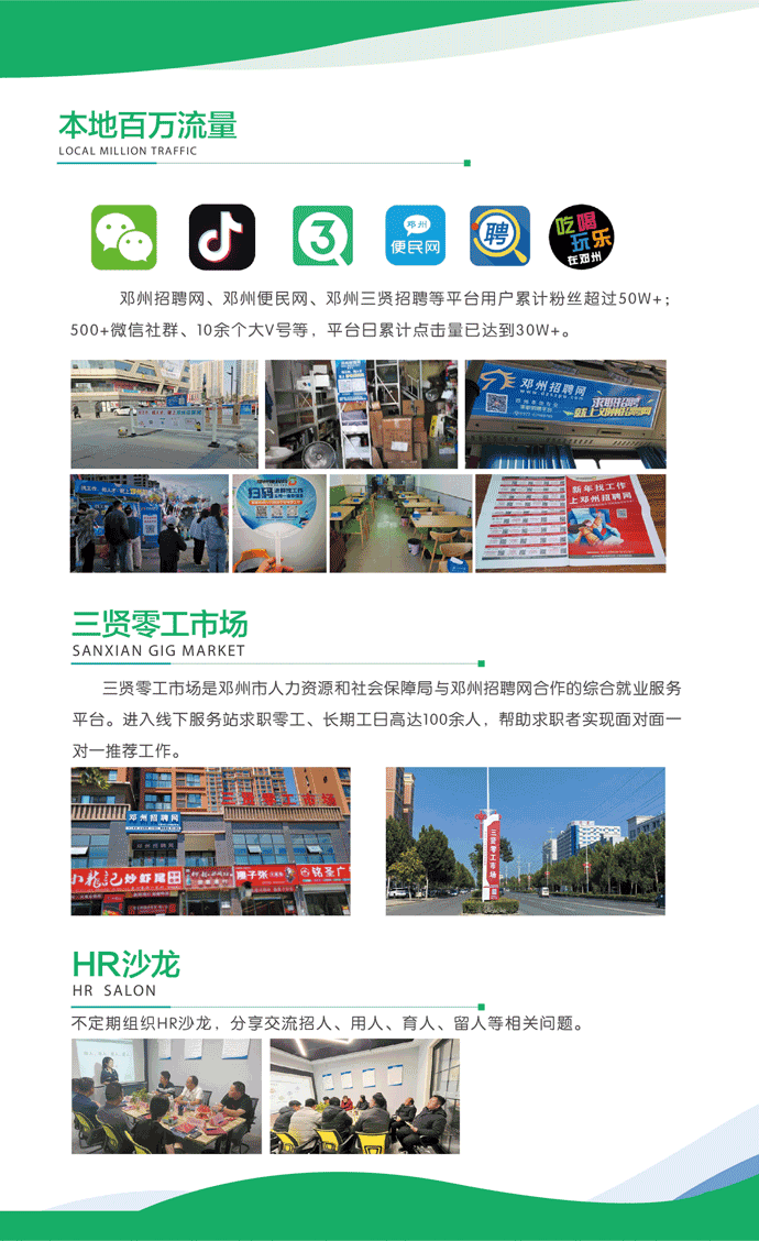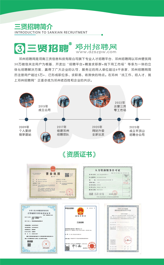 邓州招聘网隶属于河南三贤信息科技有限公司,公司成立于2015年,邓州招聘网上线于2017年,依托于公司旗下30W粉丝自媒体大V邓州便民网,迅速在招聘领域脱颖而出,经过近年来不断努力现已拥有邓州注册求职用户5W余份简历,合作企业7K余家;邓州人社局指定首家线下人才市场三贤零工市场。在邓州“找工作,招人才,就上邓州招聘网”正在逐步成为邓州老百姓和企业的共识。