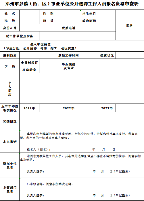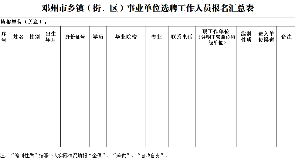(1)邓州市乡镇(街、区)事业单位选聘工作人员报名资格审查表和汇总表的电子版及纸质版(下载附表1、附表2);