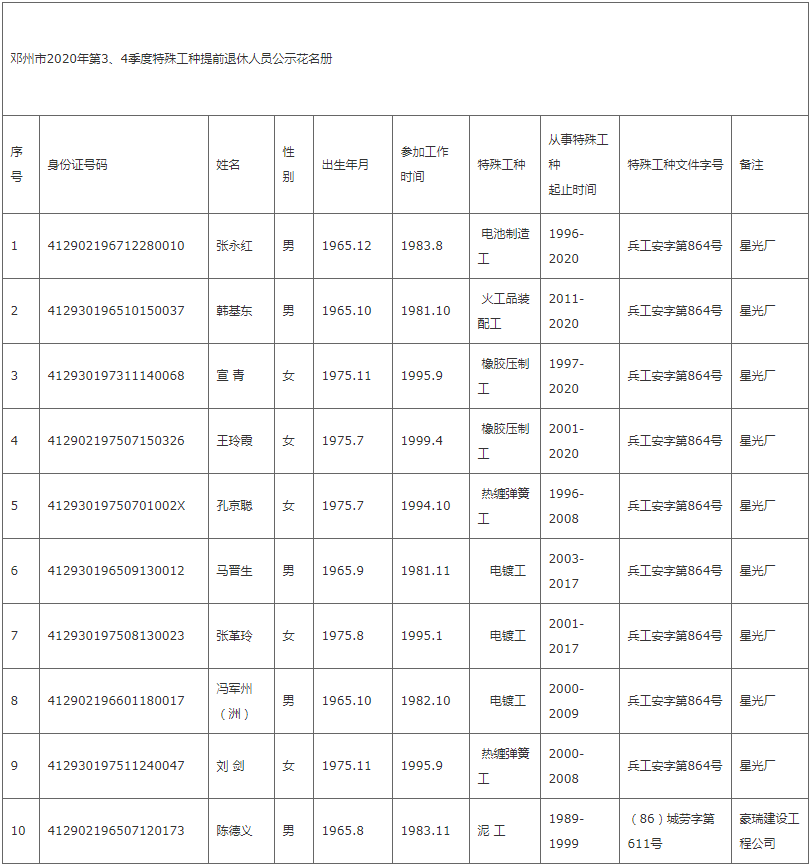 现将2020年第3、4季度办理企业特殊工种职工退休人员名单予以公示,公示期七天,自2021年1月8日至2021年1月15日,公示期内如有异议,可向邓州市人社局或上级机关举报。
