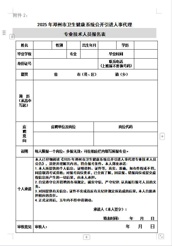 附件2:2025年邓州市卫生健康系统公开引进人事代理专业技术人员报名表