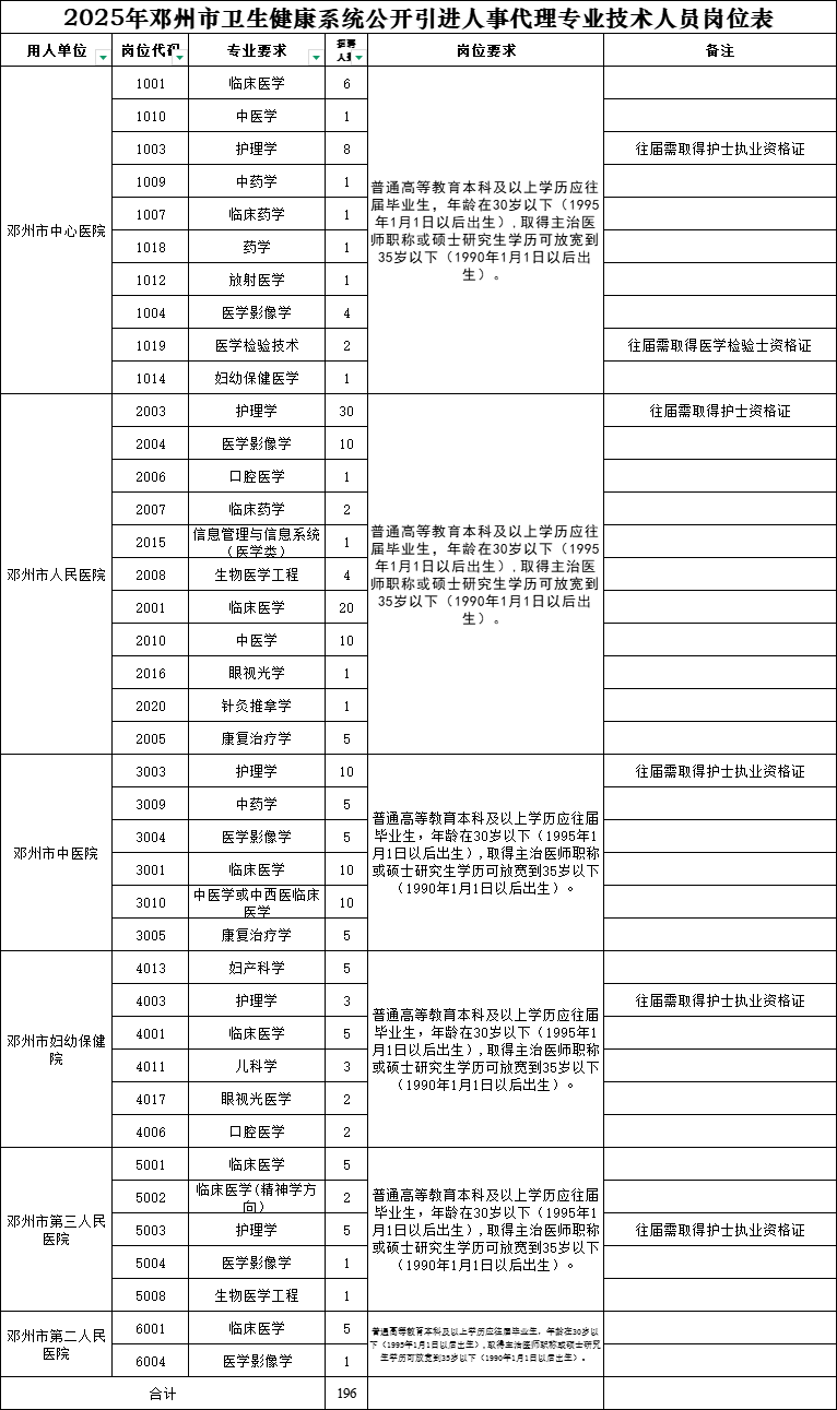 本次计划公开引进普通高等教育本科及以上学历应往届未就业毕业生196名,具体岗位详见《2025年邓州市卫生健康系统公开引进人事代理专业技术人员岗位表》(附件1)。