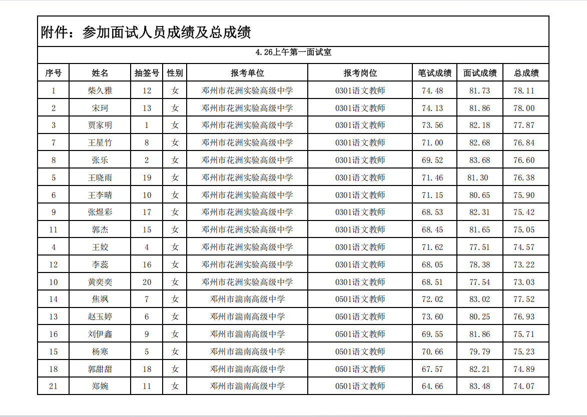 一、参加面试人员成绩及总成绩见附件,因个别岗位成绩并列需加试面试,签订就业意向人员名单及签订时间待加试面试结束后公布。