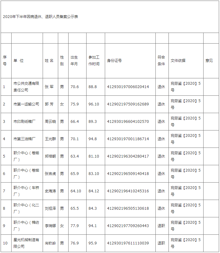 现将2020年下半年因病退休、退职人员名单予以公示,公示期七天,自2021年1月14日至2021年1月22日,公示期内如有异议,可向邓州市人社局或上级机关举报。