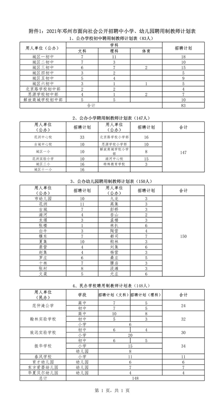 附件1:2021年邓州市面向社会公开招聘中小学、幼儿园聘用制教师计划表.pdf