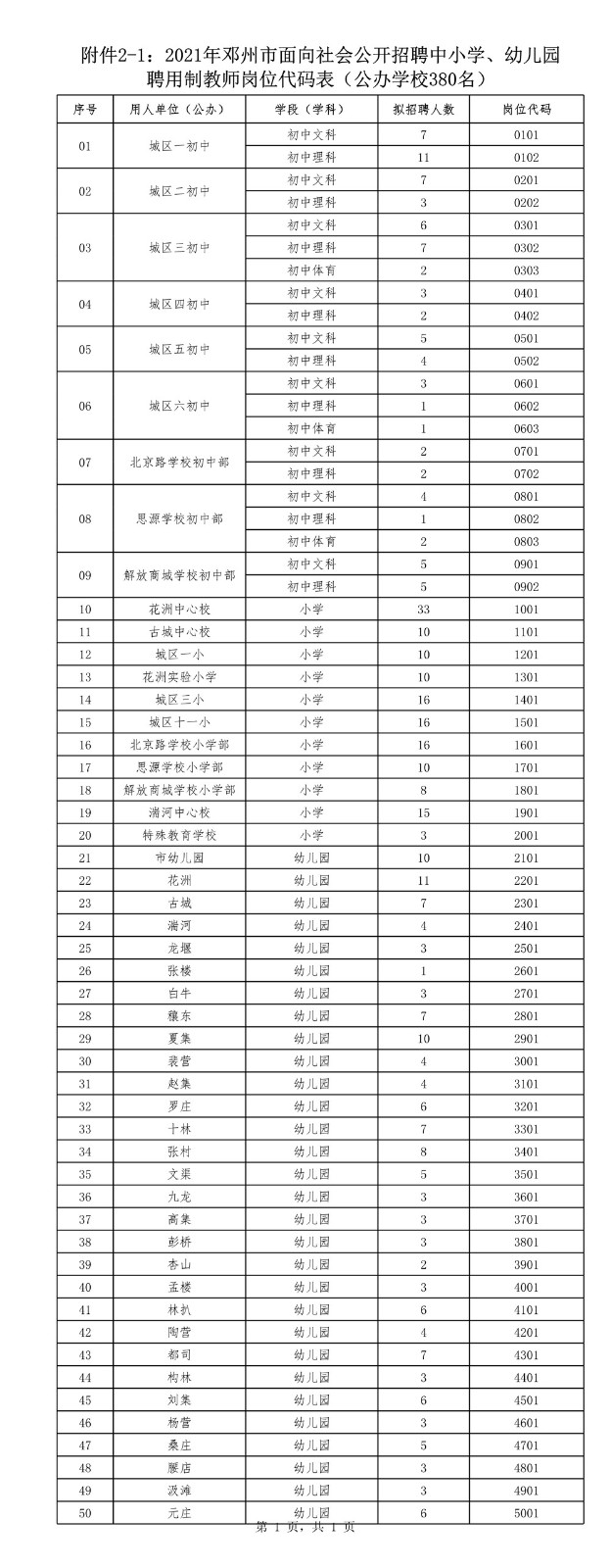 附件2-1:2021年邓州市面向社会公开招聘中小学、幼儿园聘用制教师岗位代码表(公办学校380名)